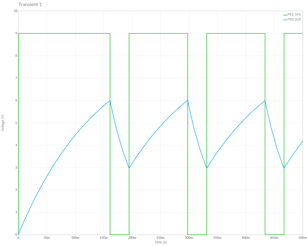The circuit repeatedly charges the 10μF capacitor (C1) through both resistors (R1 and R2), then discharges it through just R2. This creates the oscillating pattern seen in the waveforms.
