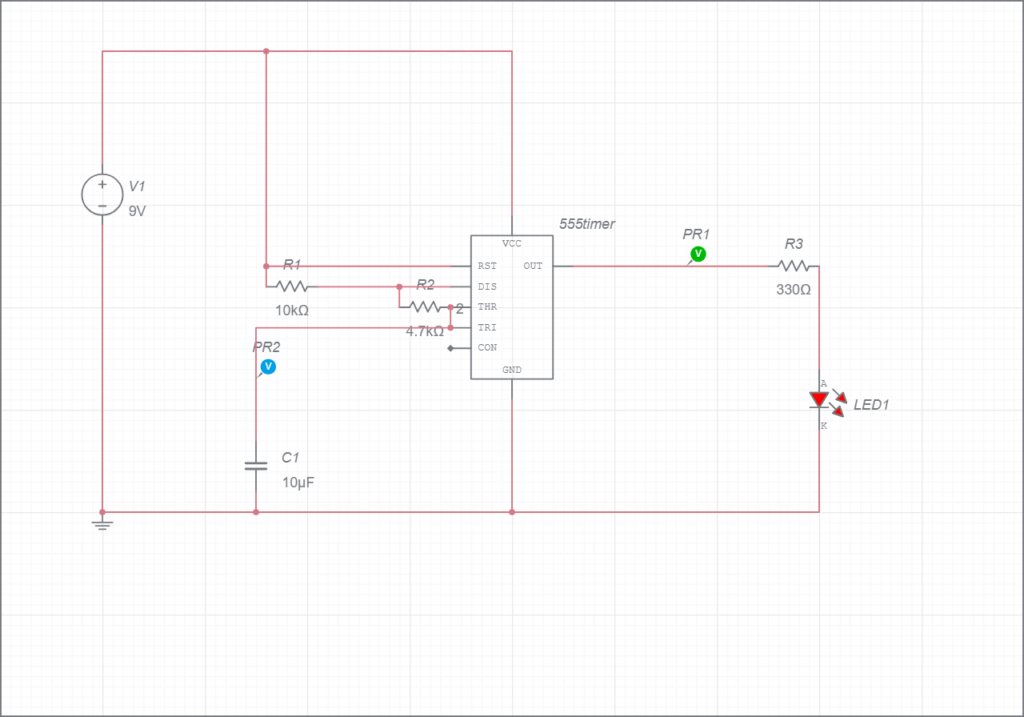 The timing components (R1, R2, and C1) determine how fast the LED flashes. The output at the Output pin of the 555 timer (shown as the green square wave) drives the LED through the 330Ω current-limiting resistor (R3), causing it to turn on and off at regular intervals.