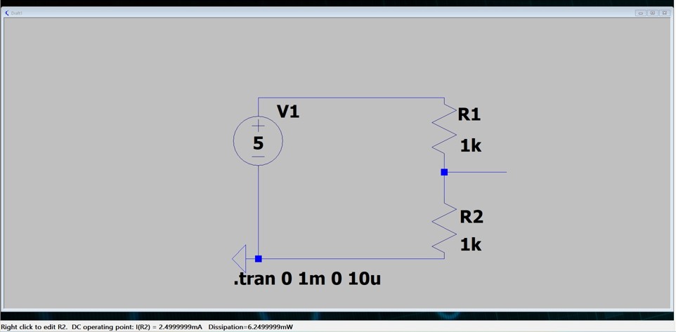 For a simple DC circuit like your voltage divider, you’ll see flat lines in the results because the voltages don’t change over time. However, the transient analysis is very useful for circuits with changing signals (like AC sources), capacitors, inductors, or other time-dependent components.